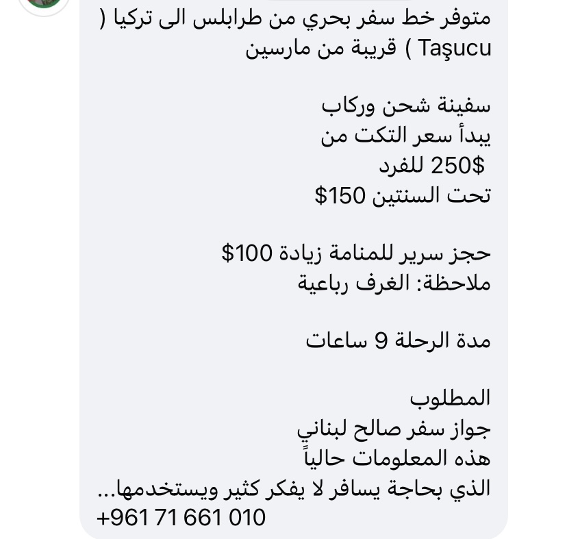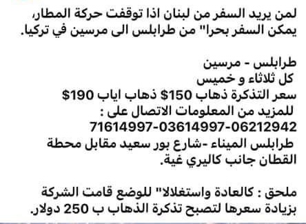 وعن سعر التذكرة قالت: يبدأ سعر التذكرة ب 250$ للفرد وتحت السنتين 150$ إضافة لحجز سرير للمنامة 100$. تنطلق الرحلة كلّ ثلاثاء وخميس من طرابلس إلى تركيا (tasucu) قريبة من مرسين، مدتها 9 ساعات".